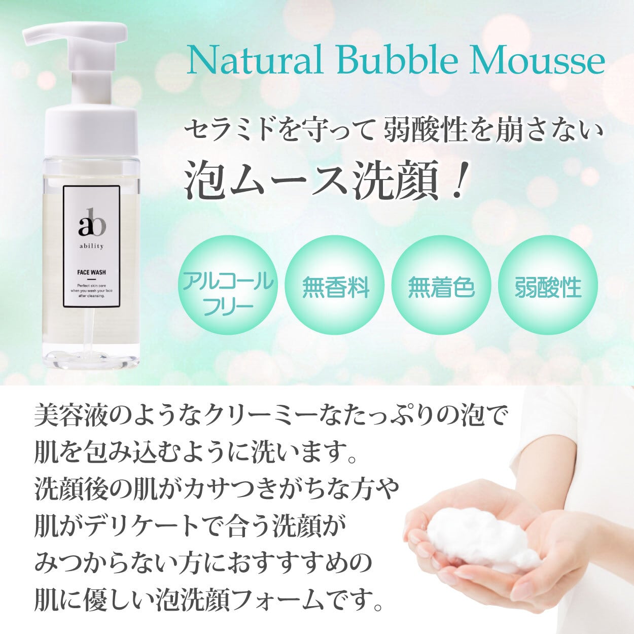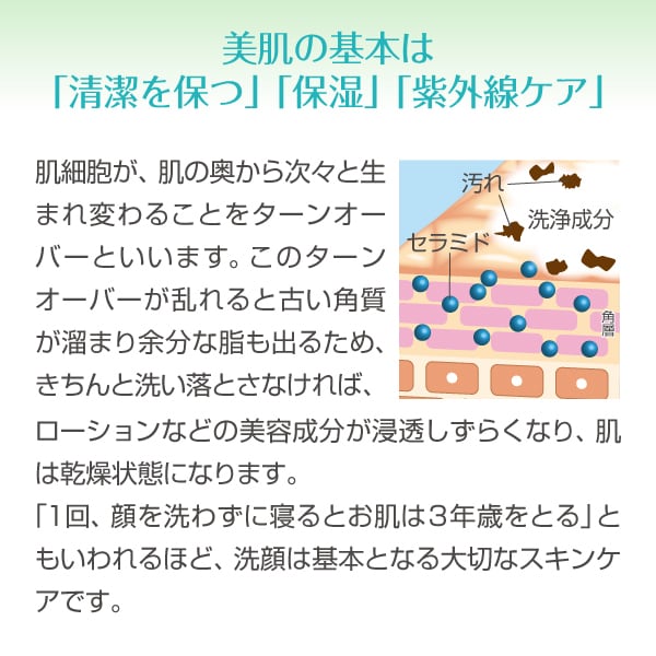 肌への負担を極力少なくしたアミノ酸系洗浄成分で、肌本来の潤い成分「セラミド」を守りながら、汗や汚れをすっきり洗い流し、お肌の弱酸性をくずしません。
